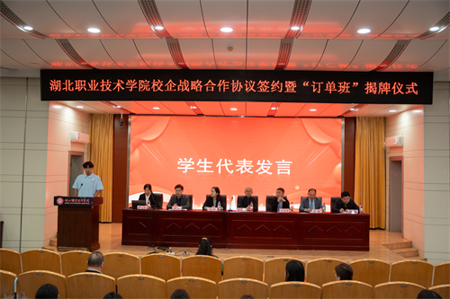 華強方特(孝感)文化科技有限公司企業代表萬俊濤表達了企業對此次校企合作的滿滿誠意與務實規劃。他表示,將把湖北職業技術學院作為“人才儲備庫”,把行業企業最新技術與實踐經驗融入教學,助力學生成長為契合企業發展需求的專業人才。訂單班學生代表黃瑞軒在發言中表示:“非常感謝學校提供從校園走向企業的橋梁,這不僅讓我們明確了未來就業方向,更能在學習中接觸企業真實項目,為畢業后快速適應工作崗位打下堅實基礎?!?/span>