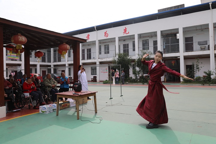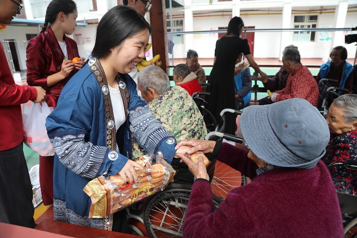 (本網訊 陳灝)孝道永流傳,中華一家親;創建文明城市,共建大美孝感。10月29日,重陽節,湖北職業技術學院石榴紅志愿服務隊走進孝南區城西社區福樂養老院,為60多位老人送上牛奶、面包、香蕉、桔子、柚子等,與老人聊天交流,表演精彩的文藝節目,與老人們共度傳統佳節。