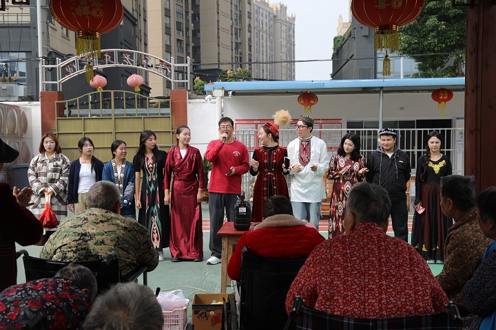 上午十時許,城西社區福樂養老院廣場其樂融融?!熬磹鄣臓敔斈棠?,我們來陪您們過節啦!”阿依舒阿克·金克斯的問候拉開活動帷幕。